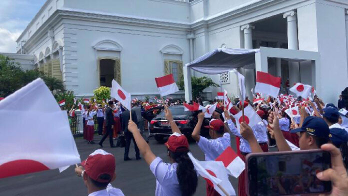 Shigeru Ishiba tiba di beranda Istana Kepresidenan Bogor pada pukul 10.00 WIB. Rombongan disambut meriah oleh barisan anak-anak sekolah yang mengibarkan bendera Jepang dan Indonesia, mencerminkan kehangatan persahabatan kedua negara.
